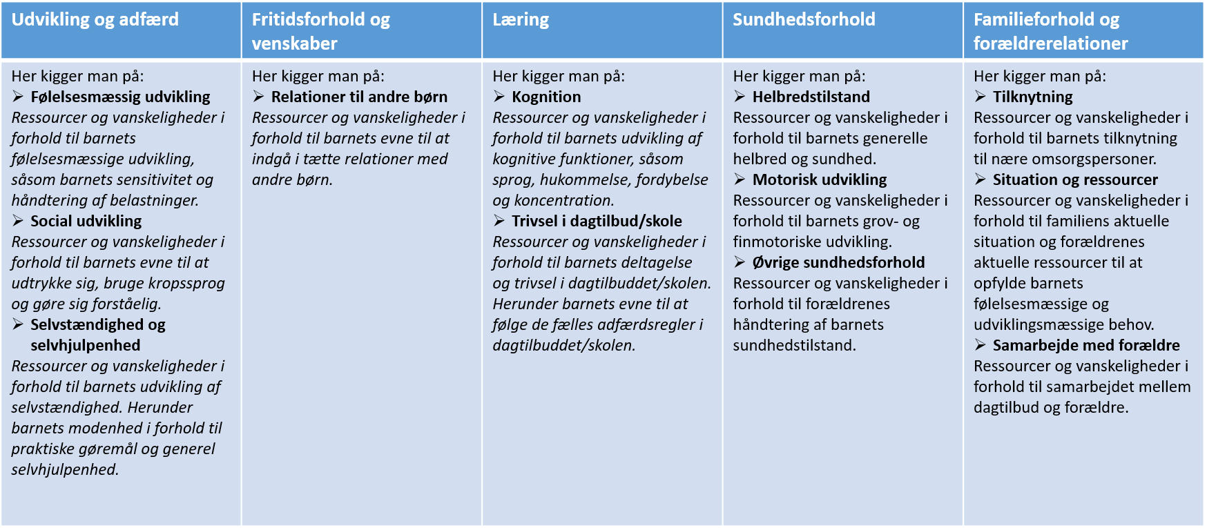 Ressourcevurderingen består af en række udsagn/spørgsmål, som barnets udvikling og trivsel vurderes i forhold til. Vurderingen er bygget op omkring nedenstående temaer: