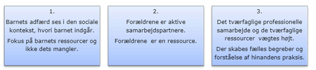 - Et andet væsentligt element i tilgangen er samarbejde mellem fagpersoner, forældre og barn. Har man dette samarbejde for øje, sikrer man det bedste fundament for at udvikle løsninger, der skaber trivsel for barnet.